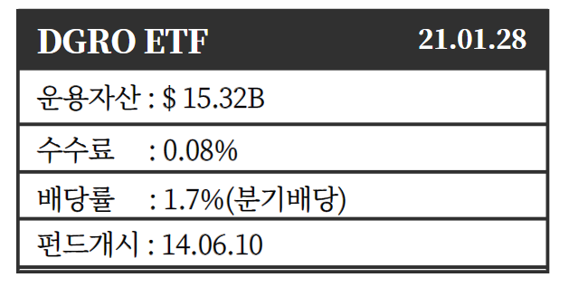 배당 성장 관련 ETF를 살펴보던 도중 DGRO가 제가 원하던 ETF로 저렴한 수수료로 과거 좋은 퍼포먼스를 보이면서