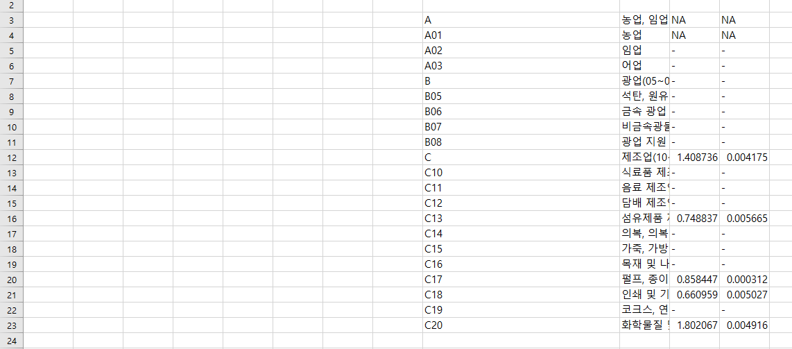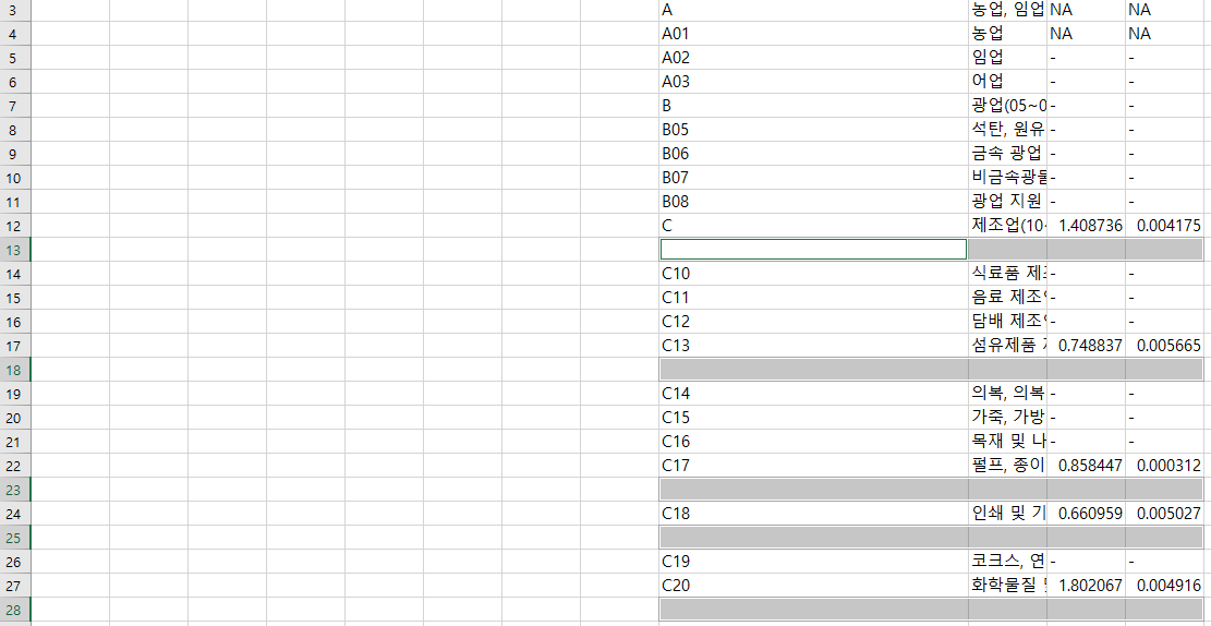 그러면 이렇게 병합된 셀이 풀리면서 데이터 있는 행과 없는 행으로 나뉘게 됩니다