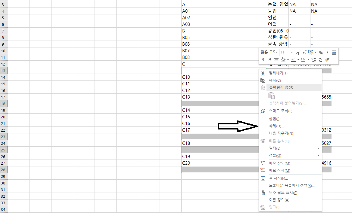 오른쪽 클릭으로 선택된 부분을 행 전체 삭제로 진행해주시면 됩니다