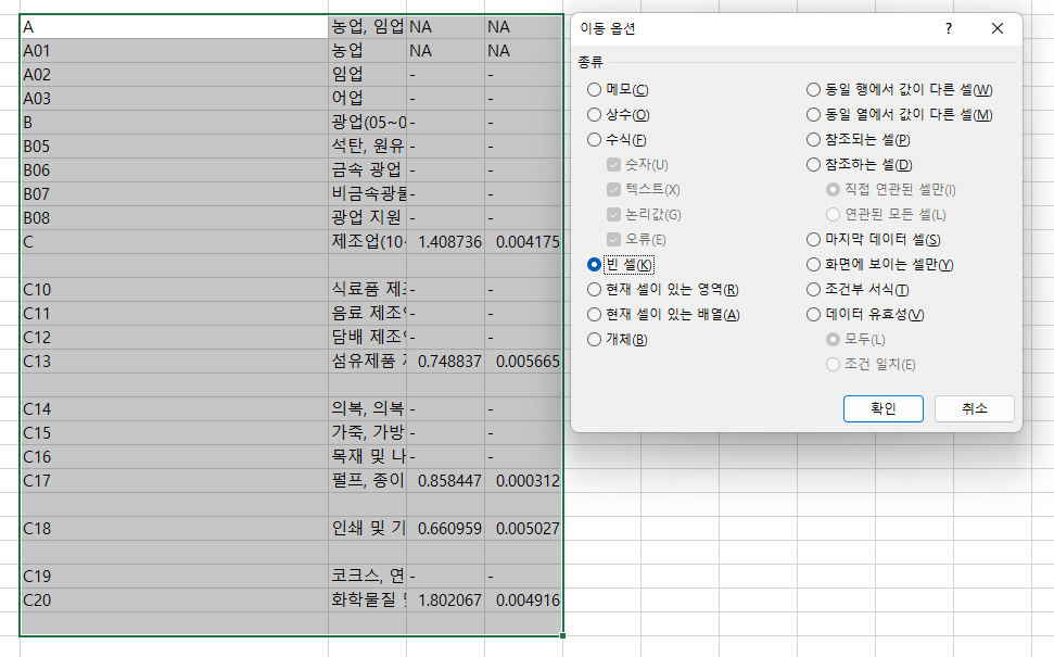 이동 옵션 선택항목에서 빈 셀(K)를 누르고 확인을 눌러줍니다