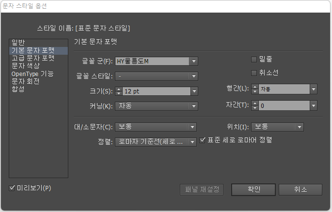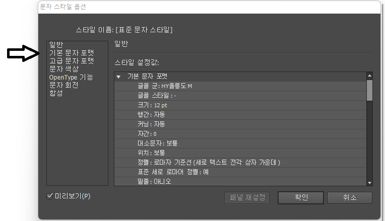 문자 스타일 옵션창에서 '기본 문자 포맷'을 누릅니다